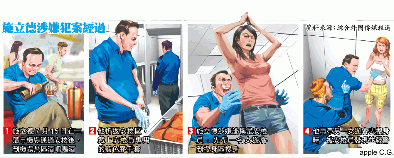 英美多間傳媒圖文並茂報道施立德醉酒鬧機場的事件,並附上施立德的facebook相片。報道指,施上周在三藩市機場A區通過安檢,到機場禁區的酒吧喝酒數小時後折返安檢區。施身穿卡其褲和藍色polo恤,與安檢員制服相似。閉路電視拍得他在該處流連約40分鐘,並戴上安檢員專用的藍手套。他涉嫌向一名亞裔女遊客自稱美國運輸安全局(TSA)職員,並帶她到私人搜身區搜身。他企圖為另一女遊客搜身前,遭其他安檢員發現並報警。當局規定,男安檢員為女士搜身時,必須有女安檢員陪同。