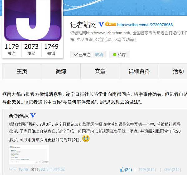 7月4日下午新浪認證的《記者站網》官微稱7月3日,《遂寧日報》記者劉欣雨因在報導中將某領導名字寫錯一個字,後被報社領導批評,於當日晚上「自殺」身亡。(網絡截圖)