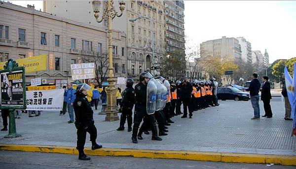 19日,阿根廷副總統接見習近平。在經歷前兩次教訓後,阿根廷防暴警察為了保護法輪功學員,將中共打手特務和法輪功學員分開。(大紀元)
