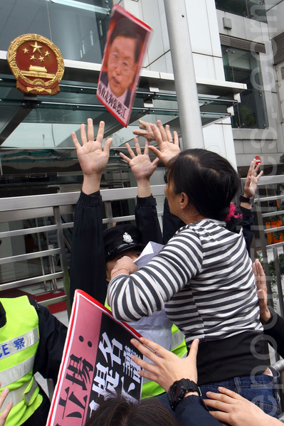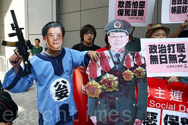 張德江多次發表針對香港人權、民主的的言論,遭到港人抗議。圖為社民連到警察總部,抗議江派核心人物、中共人大常委會委員長張德江日前高調撐香港梁振英和警務處處長曾偉雄,斥責警察已成為當局的鎮壓工具。(潘在殊/大紀元)