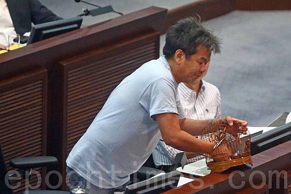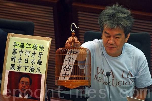 社民連議員梁國雄(中)諷刺張德江的鳥籠政改無恥。(潘在殊/大紀元)