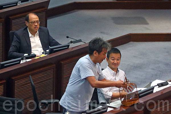 社民連的梁國雄議員則擺出鳥籠道具,諷刺政府及中央只給予香港一個「鳥籠政改」,並作了一首詩斥責張德江無恥:「張牙舞爪,德才不濟,江河日下,無中生有,恥寡鮮廉」。發言期間,民建聯議員蔣麗芸突然上前取走鳥籠道具,指其擋住視線,梁國雄追回後,當場將鳥籠打爛,稱是張德江的鳥籠民主,拿出裏面寫著「和平佔中、普選特首」的字條,表明是港人的訴求。