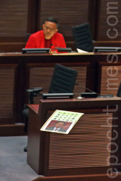 香港泛民主派批評張德江分化香港和操縱政改,社民連議員梁國雄丟擲張德江的圖像。(潘在殊/大紀元)