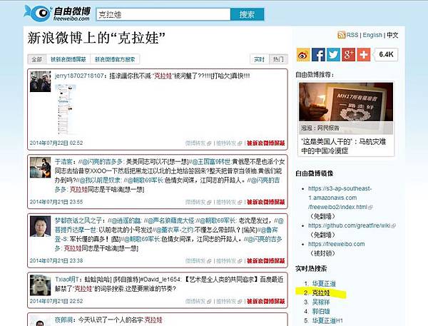 海外實時保存新浪微博信息的自由微博上顯示「克拉娃」排在實時搜索的熱詞第2位。(網頁截圖)