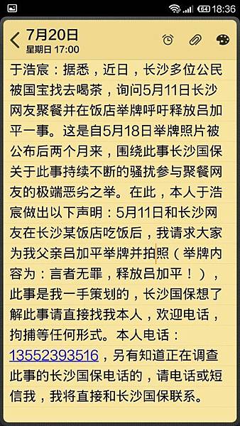 20日,于浩宸在網上就長沙公安國保不斷騷擾參與舉牌公民的極端惡劣之舉發表聲明:「5月11日和長沙網友在長沙某飯店吃飯後,我請求大家為我父親呂加平舉牌並拍照(舉牌內容為:言者無罪,釋放呂加平!),此事是我一手策劃的,長沙國保想瞭解此事請直接找我本人,歡迎電話、拘捕等任何形式。」