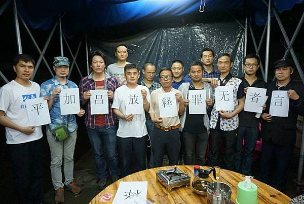 今年5月11日于浩宸和長沙的一些公民進行聚餐、並在飯店內舉牌呼籲無罪釋放呂加平,舉牌照片從左到右為傅翔、誇父、於浩宸、何家維、歐彪峰、李原風、徐琳、肖振華、周周煮粥、賈?、周再強、卓宇、謝長禎。(知情者提供)
