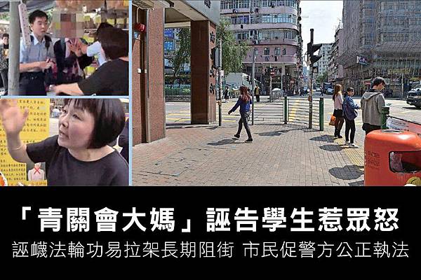 自前特首梁振英2012年上台以來出現的中共外圍組織「香港青年關愛協會」(青關會),在全港各區誣衊滋擾法輪功和市民已有近六年,引發眾怒。日前,一名在深水埗擺放誣衊法輪功易拉架的親共團夥「大媽」,誣告一男學生「偷竊」,被正義市民譴責是「共匪」,有關視頻經傳媒報道後在網上廣傳,引發社會熱議。有市民呼籲警方公正執法,不容親共組織成員在港搞事。有網民也指「青關會應該在香港消失」。