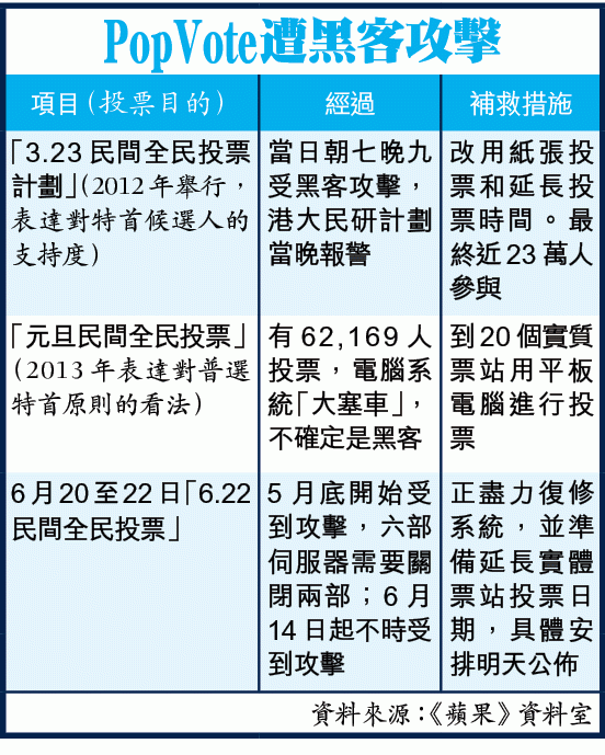 ■6.22全民投票系統PopVote遭黑客攻擊至癱瘓,和平佔中計劃延長實體投票時間。