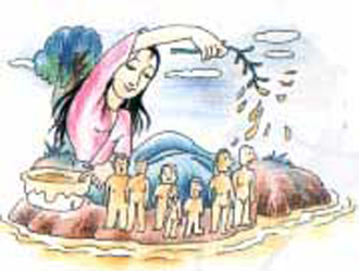 中國的漢族傳說女媧造人。盤古開闢天地之後,不知經過多少年,忽然在天地間出現女媧,她在正月初七這一天用黃土和水,仿照自己的樣子造出了一個個小泥人,她造了一批又一批,覺得太慢,於是用一根籐條沾滿泥漿,揮舞起來,一點一點的泥漿灑在地上,都變成了人。這些小人成群地走向平原、谷地、山林,從此以後地球上才有了人類。為了讓人類永遠的流傳下去,女媧制定了嫁娶之禮,讓人憑自己的力量傳宗接代。