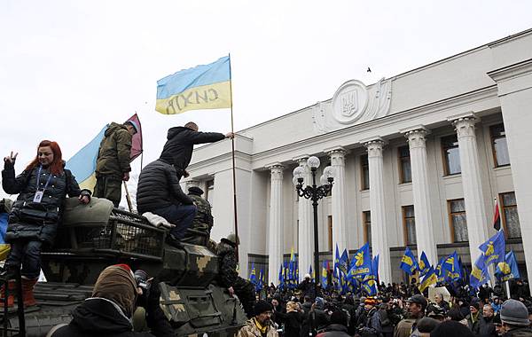 當地時間2月27日,幾十個武裝份子持槍佔領了烏克蘭南部克里米亞地區政府辦公大樓和議會,掛出俄羅斯國旗,挑釁烏克蘭的新領導人。為此,烏克蘭臨時政府向俄羅斯發出警告。圖為27日基輔的議會大樓前,人們舉出烏克蘭國旗。( AFP PHOTO / YURIY DYACHYSHYN)(記者林南綜合報導)