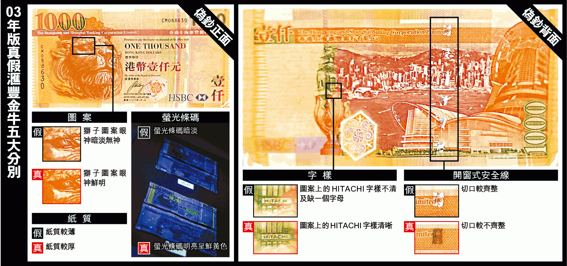 司警指出,滙豐假鈔的紙質較薄,其開窗式保安線切口較齊整,假鈔的獅子圖案的眼神沒有真鈔的鮮明及傳神。在放大鏡下,真鈔圖案建築物印有HITACHI的清晰字樣,假鈔相對較不清晰及隨機缺失任何一個字母。在黑暗環境、紫外光燈照射下,真鈔的螢光條碼較偽鈔光亮及呈鮮黃色。今次發現的滙豐偽鈔與早前發現的中銀偽鈔的印刷技術十分相似,不排除是同一犯罪集團所為。