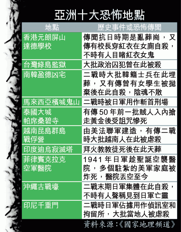 上述節目名為《I Wouldn't Go In There》,美國有線新聞網絡(CNN)昨引述該節目主持人Robert Joe指,選取這十大亞洲恐怖地點時,最初是被這些地點的靈異傳聞吸引,探索下去才發現部份曾發生的事件,比鬼怪傳聞還要恐怖,這些地點集中在東南亞,及分散於日、韓、台和香港(見表)。其中元朗屏山文物館附近的達德學校,被Robert Joe形容為「是出現鬼故及超自然事件的完美場所」,通往學校的路被山墳包圍,的士司機都拒絕前往。另有曾到該處探險的網民稱,已荒廢15年的學校剩下破爛玻璃,和滿地衣紙蠟燭。