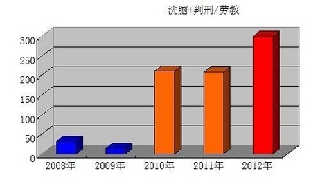 以石家莊市為例,2008年至2012年判刑+洗腦的人數與被勞教人數的比率一直在上升。