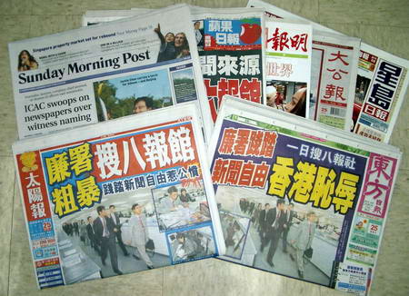 廉署搜索香港八家報社,各家媒體大篇幅報道此事,更指廉署此舉是踐踏香港新聞自由。