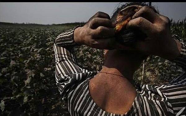在山西臨汾市污染嚴重地區,農民在棉花地裡干了兩小時的活之後全身都是煤灰。2007年9月24日(網絡圖片)