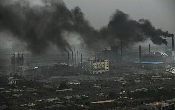 內蒙古拉僧廟發電廠二條黑色的巨龍覆蓋著村莊。2005年7月26日(網絡圖片)