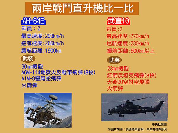 外界關注兩岸攻擊直升機的戰力比較。相較於武直10,吳天安表示,AH-64E的武器攜帶量、精準度、穿甲能力,整體打擊能力等,均較「武直10」更好。