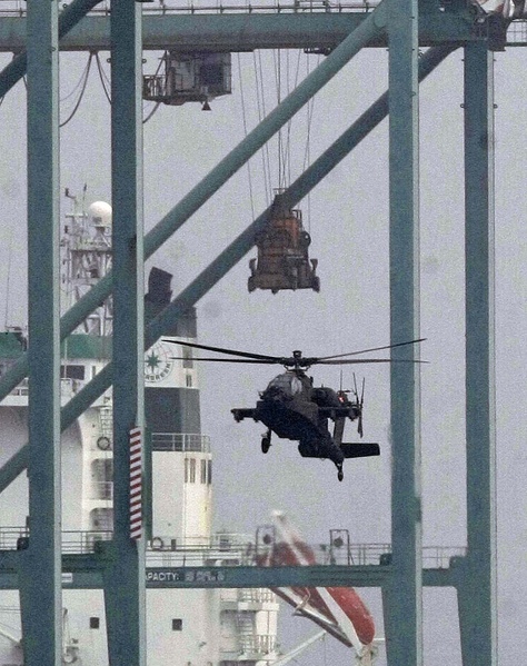 陸軍表示,最新型阿帕奇直升機4日以海運方式運抵高雄港後,在高雄港吊掛、組裝,進行地面測試。首批6架AH-64E阿帕奇攻擊直升機已全部組裝完成。