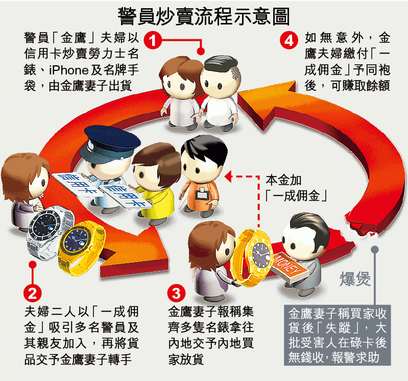 早前,金鷹夫婦聯同其他警員,開始炒賣勞力士名錶,當中主要以Daytona、Submariner及GMT Master II型號為主,手錶價格高昂,金鷹要求同袍碌卡買貨,並答應付予一成佣金,不少人立即響應碌卡買錶,然後將名錶全數交予金鷹妻子。