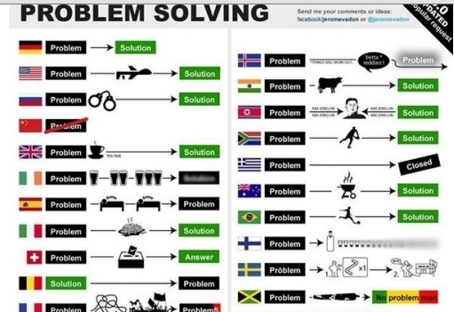 近日有網民在臉書做了一張有內涵的圖,裡面寫著世界各大國家遇到問題的解決方式,從中可看出一個國家的民族性,其中中國最「絕」。(網絡圖片)