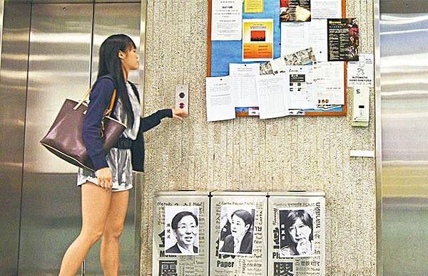■演藝學院的環保回收箱,貼上建制派議員頭像,諷刺他們是廢物。李家皓攝