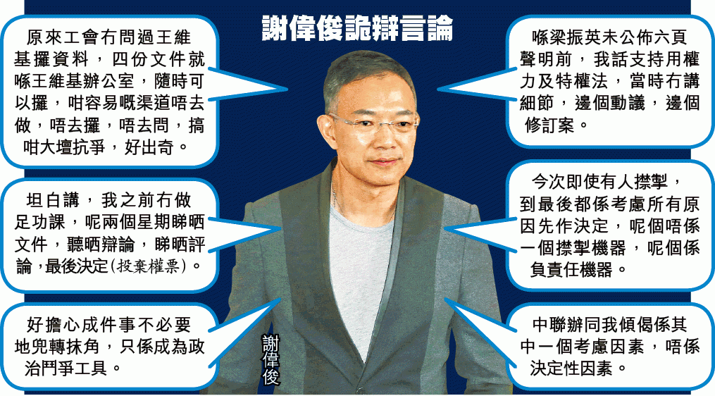 牠又詭辯稱:「我原先係好廣泛(表態),在梁振英未公佈六頁聲明前,我話支持特權法,當時無講細節,邊個動議,邊個修訂案。」又指泛民的議案就算通過亦找不到真正「死因」,根本只是做騷。一夜變臉的他更抹黑港視員工,質疑「工會無問過王維基攞資料,四份文件就喺王維基辦公室,隨時可以攞,咁容易渠道唔去做,唔去攞,唔去問,搞咁大壇抗爭,好出奇!」諷刺員工「盲頭烏蠅撞玻璃」,背後可能被人操縱為政治鬥爭工具。