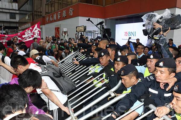 高鐵香港段醜聞引發又一波反高鐵浪潮。多個團體遊行抗議工程浪費公帑,期間與警發生推撞。(蔡雯文/大紀元)