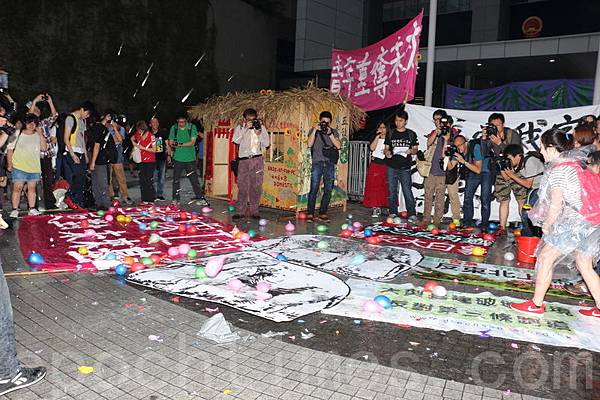 當遊行隊伍抵達添馬街時,警方要求示威者與道具「分開走」,即示威者要走上天橋,道具則由警方協助送到終點政府總部,觸發示威者不滿,有人走出馬路推鐵馬,試圖越過警方防線,警方向示威者施放胡椒噴霧,有示威者面部被射中,包括立法會議員梁國雄及學民思潮成員,有人則開傘遮擋。擾攘一段時間後,遊行隊伍約6點鐘抵達政府總部,向放在地上的大白象丟擲水彈。晚上,警方宣佈遊行期間共施放11次胡椒噴霧,4名示威者被捕。