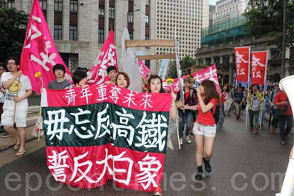 「青年重奪未來」等約17個反高鐵團體,昨日發起「毋忘反高鐵、誓反大白象」大遊行,抗議高鐵天價工程超支嚴重。約150名示威人士下午3時先在中環遮打花園集會,並圍繞舊立法會一圈,重演4年前反高鐵運動包圍立法會的情況,再遊行至政府總部。