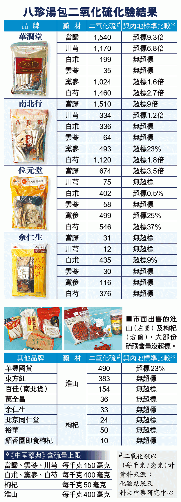 大陸藥材用硫磺加工氾濫,一碗補身藥材湯隨時是傷身有毒的硫磺湯。蘋果日報抽驗華潤堂、南北行、位元堂、余仁生出售的八珍湯包;及北京同仁堂、裕華、百佳超市等出售的淮山及枸杞,32個樣本全部含有硫磺產生的二氧化硫,其中華潤堂最離譜,八珍湯包內的當歸含硫量超標9.3倍,長期服用會影響肝、腎及消化系統。