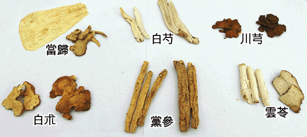 ■化驗八珍湯包的六種藥材,包括當歸、白芍、川芎、白朮、黨參及雲苓,左邊是經硫磺加工;右邊是藥材原貌。