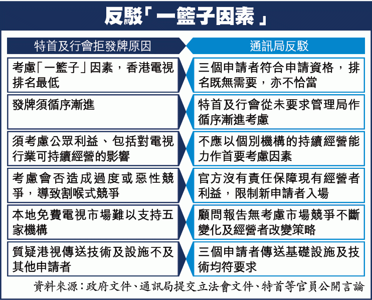 多名行會成員連日稱擔心電視台倒閉影響社會,又指有線及電盈較港視優勝。通訊局卻指沒責任保障現有電視台利益而限制新競爭者加入市場,而應透過競爭增加節目選擇讓社會受惠。三家申請者都證明有能力符合牌照要求,局方認為批出三牌「最符合公眾利益」,「將三家申請機構作出排名,既無需要,也不恰當;而管理局亦從未作出排名」。