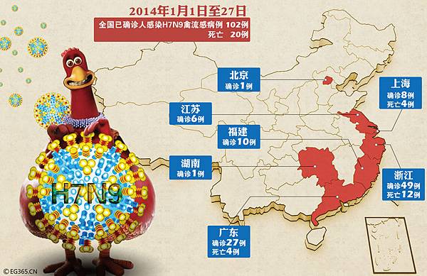 27日各地又通報新增6例,累計H7N9病例達102例,其中浙、粵、滬三地達84例;死亡的20個病例中,浙江12例,廣東4例,上海4例。