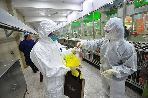 大陸H7N9禽流感疫情持續升溫,除浙江、廣東等南方省份病例持續增加外,疫情日前已北上攻入北京,令京民恐慌,當局稱將關閉全部活禽市場。圖為,2014年1月26日,上海市區最大的活禽零售點三角地水電市場,虹口區疾控中心專家正在進行涉禽樣品採樣。(大紀元資料室)