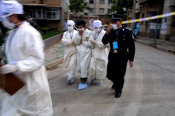 北京民眾稱,現在H7N9禽流感疫情要比SARS還嚴重,北京市在2003年SARS大爆發的時候,病人都被運到小湯山傳染病院,由軍隊介入管理。從中共高層得到的消息稱不少病人是被直接活埋處理。現在北京市已經準備好了軍隊,一旦H7N9禽流感疫情不能控制,就會像SARS一樣處理。圖為:2003年5月24日上午,昆明市防SARS的一個預演,在警察的監控下把病人隔離。(大紀元資料室)