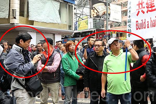 2月16日出現在《城市論壇》圍攻李慧玲的愛字頭成員(左),去年3月3日也曾經出現在香港銅鑼灣青關會侵擾法輪功真相點的現場。青關會副會長林國安(右一)、會長楊江(右二)一同被攝入鏡,垃圾歸邊就正是如此。(潘在殊/大紀元)