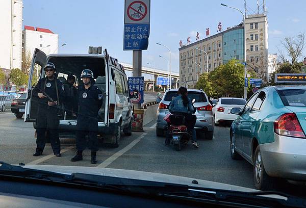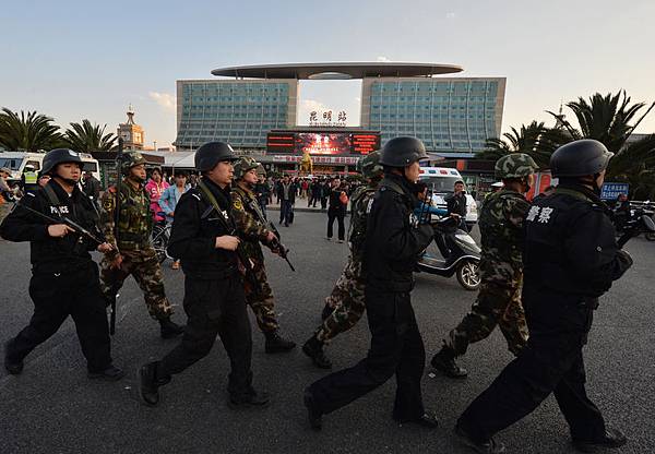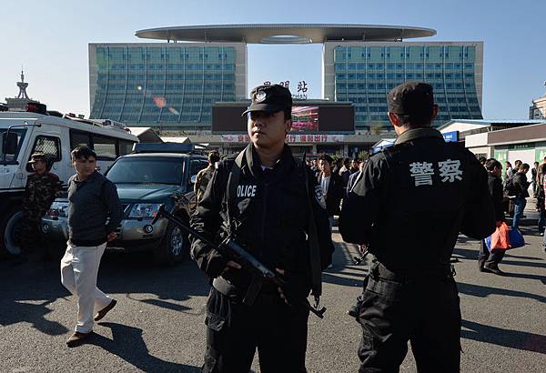 昆明市自3月1日爆發火車站血腥砍人事件後,全城民眾皆陷入高度恐慌之中,雖然街頭警察數量增加兩倍,但百姓人心惶惶,街道和餐館的人流驟然減少。圖為,3月3日在火車站外巡邏的警察。(MARK RALSTON/AFP/Getty Images)