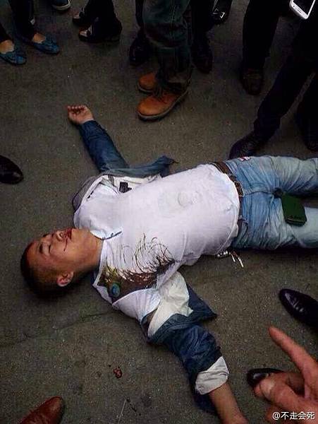 4月19日上午,溫州蒼南縣靈溪鎮5城管與女菜販發生爭執,一過路男子拿手機拍照遭到城管圍毆倒地吐血。黃姓男子嘴角有血,白色T恤衫的腹部位置有明顯的黑色腳印。(網絡圖片)