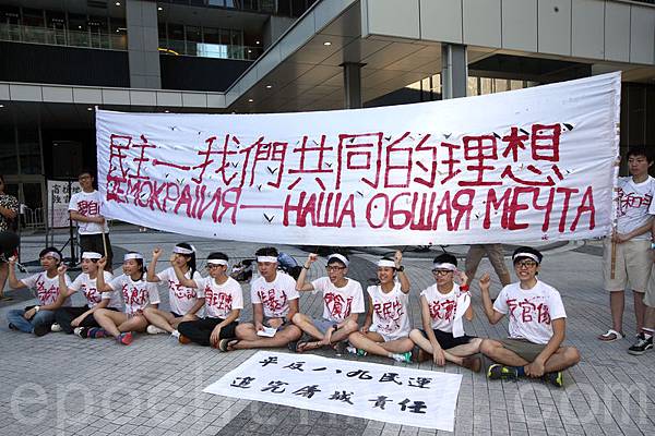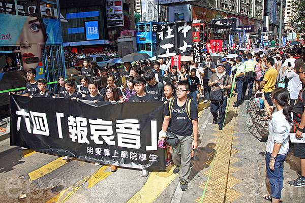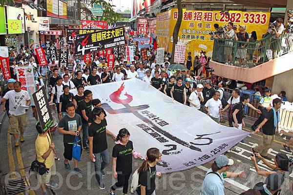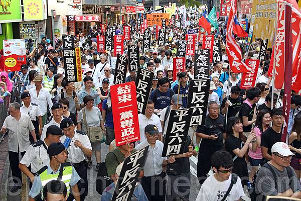 香港支聯會6月1日舉行六四25周年大遊行,在天文台發出酷熱天氣的警告下,仍有3千人參加遊行,比去年多,許多大陸遊客被遊行隊伍的氣勢感動和震憾。(潘在殊/大紀元)