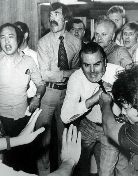 1977年廉署因大舉拘捕涉貪污警察而觸發警廉衝突,一名警察企圖把當時的副執行處長夏烈(被扯領帶者)扯出來 。