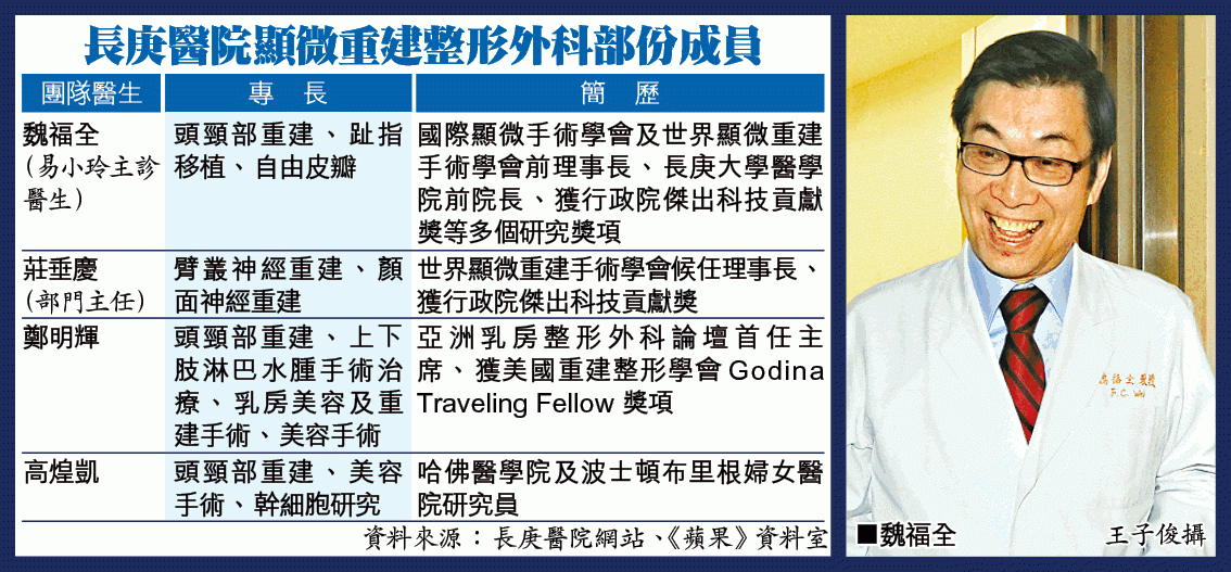 成功為易小玲修復下顎的長庚醫院顯微整形外科中心是整形外科的少林寺,除了易小玲的主診醫生魏福全是重建整形手術的國際權威外,中心其他醫生亦是不同整形範疇的專家,令中心吸引不少海外專家前來取經。