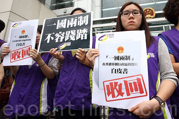 中共政治局常委劉雲山把持的國務院新聞辦6月10日發表的《一國兩制在香港實踐》白皮書,引發香港民間的強烈憤怒。多個政團6月11日到中聯辦抗議,批評中共違反《中英聯合聲明》中的國際承諾,破壞一國兩制。(潘在殊/大紀元)